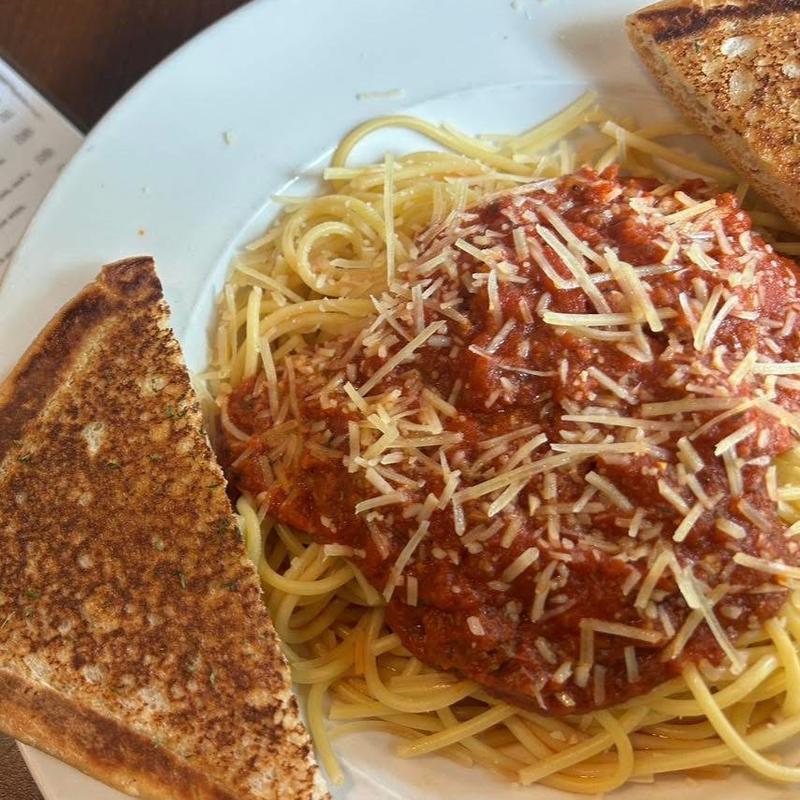 You can’t go wrong with a big bowl of pasta, covered in a perfectly seasoned and simmered meat sauce. Served with a side salad to start.