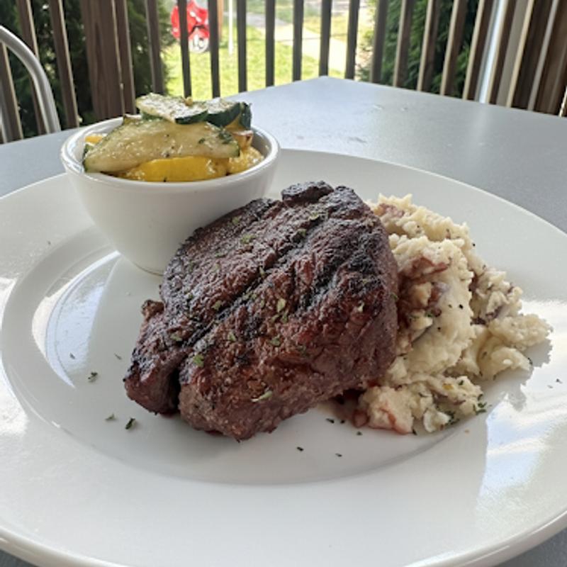 8 oz fresh-cut sirloin, seasoned for the perfect flavor. Served with mashed potatoes and seasonal vegetables.